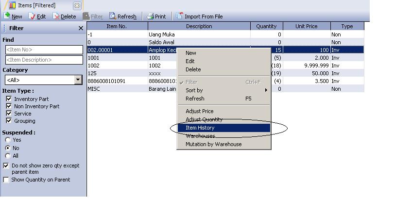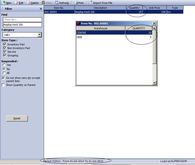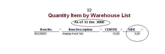 - Langkah selanjutnya juga bisa dilihat dari menu Report | Warehouse | Quantity Item by Warehouse List. Parameter tanggal dimundurkan sejauh mungkin untuk mengetahui Ending Balance dari gudang bersangkutan. Dari ilustrasi diatas terlihat pada laporan di bawah ini gudang “Side” kondisi akhirnya adalah nol, sehingga ketika dibuat transaksi keluar dari gudang tsb, dikonfirmasi tidak mencukupi.