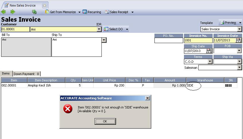 Apabila kita sedang membuat transaksi keluar atau out misalkan sales invoice, terkadang dikonfirmasi error seperti pada contoh di bawah ini.